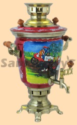 Самовар: - объем 4 литра - высота самовара 43 см - ширина самовара по ручки 30 см - материал: латунь - расписан вручную, покрыт лаком - мощность ТЭНа 1 кВт, время закипания 18-20 минут - вес самовара 2,6 кг Производитель Россия (Тула)