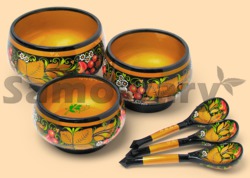В наборе 3 плошки и 3 ложки Высота самой большой плошки 11 см, диаметр 17 см Высота самой маленькой плошки 8 см, диаметр 14 см Длина ложки 18 см Ручная роспись Материал дерево Производитель Россия