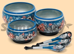 В наборе 3 плошки и 3 ложки Высота самой большой плошки 11 см, диаметр 17 см Высота самой маленькой плошки 8 см, диаметр 14 см Длина ложки 18,5 см Ручная роспись Материал дерево Производитель Россия