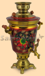 Самовар: - объем 4 литра - высота самовара 43 см - ширина самовара по ручки 30 см - материал: латунь - расписан вручную, покрыт лаком - мощность ТЭНа 1 кВт, время закипания 18-20 минут - вес самовара 2,6 кг Производитель Россия (Тула)