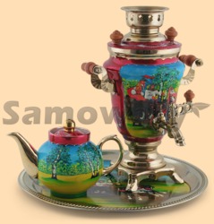 В комплекте заварочный чайник и поднос Самовар: - объем 1,5 литра - высота самовара 33 см - ширина самовара по ручки 24 см - материал: латунь - расписан вручную, покрыт лаком - мощность ТЭНа 1 кВт, время закипания 15 минут - вес самовара 2 кг Чайник: - объем чайника 700 мл - вес чайника 500 гр - материал: фарфор - расписан вручную, покрыт лаком Поднос: - размер 35 см - вес подноса 400 гр - форма подноса может отличаться от фото, возможные формы подносов - круг (диаметр 35 см), овал (34 на 46 см), прямоугольник (30 на 40 см), арка (23 на 40 см), ключ (31 на 41 см), более подробную информацию вам предоставит менеджер - производитель Тула