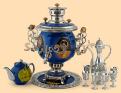 В комплекте комбинированный самовар (растапливается с помощью дров или электричества), заварочный чайник и поднос Самовар: - объем 4,5 литра - материал: полированная латунь - авторская роспись, ручная работа - мощность ТЭНа 1.5 кВт - время закипания 15-25 минут - так же может растапливаться с помощью дров или шишек (комбинированный самовар) Заварочный чайник и сахарница: - керамика - авторская роспись, ручная работа Поднос: - металл - диаметр 35 см - авторская роспись, ручная работа Производитель Тула