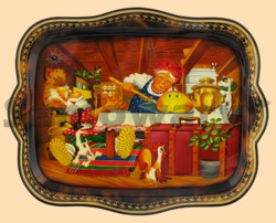 Поднос изготовлен в деревне Жостово - основание металл, далее грунтовка, РУЧНАЯ роспись в несколько заходов, 2-3 слоя лака чтобы защитить рисунок и сам поднос (причем лаком он покрывается с двух сторон - спереди и сзади). ВСЕ подносы изготовлены полностью вручную, частными художниками, которые живут в деревне Жостово, именно поэтому эти подносы и называются ЖОСТОВСКИМИ. Но они не фабричные, поэтому и цена дешевле! Сзади нет клейма фабрики, но зато на рисунке с лицевой стороны есть подпись художника, который нарисовал этот поднос. И да, этот художник обычно раньше как раз и работал на этой Жостовской фабрики. Так что выбор за вами - либо фабричный дороже, либо от частного художника, но который рисует на себя. Причем учтите, фабричные подносы, кроме того что стоят дороже (если сравнивать один и тот же размер подноса) всегда имеют более бедный рисунок и большие фоновые поля.