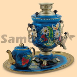 Каталог » Самовары ЭЛЕКТРИЧЕСКИЕ » Самовары электрические на 3л в наборе (расписные - цветы и ягоды) » Набор электрический Садовый на голубом (3л)