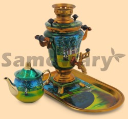 В комплекте заварочный чайник и поднос Самовар: - объем 1,5 литра - высота самовара 33 см - ширина самовара по ручки 24 см - материал: латунь - расписан вручную, покрыт лаком - мощность ТЭНа 1 кВт, время закипания 15 минут - вес самовара 2 кг Чайник: - объем чайника 700 мл - вес чайника 500 гр - материал: фарфор - расписан вручную, покрыт лаком Поднос: - размер 35 см - вес подноса 400 гр - форма подноса может отличаться от фото, возможные формы подносов - круг (диаметр 35 см), овал (34 на 46 см), прямоугольник (30 на 40 см), арка (23 на 40 см), ключ (31 на 41 см), более подробную информацию вам предоставит менеджер - производитель Тула