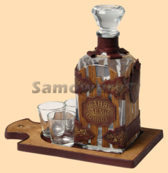 Объем 500 мл Высота 27 см В комплекте 3 рюмки из стекла, объем 50 мл, высота 5,5 см Материал футляра: натуральная телячья кожа натурального дубления. Стекло для пищевых продуктов, прошедшее государственную гигиеническую регистрацию. Крышка герметично фиксируется в горлышке графина. Изделие упаковано в упаковку из микро-гофрокартона. Производитель Белоруссия