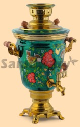 Самовар: - объем 4 литра - высота самовара 43 см - ширина самовара по ручки 30 см - материал: латунь - расписан вручную, покрыт лаком - мощность ТЭНа 1 кВт, время закипания 18-20 минут - вес самовара 2,6 кг - производитель Тула Производитель Россия (Тула)