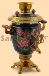Самовар: - объем 3 литра - высота самовара 36 см - ширина самовара по ручки 29 см - материал: латунь - расписан вручную, покрыт лаком - мощность ТЭНа 1 кВт, время закипания 15-20 минут - вес самовара 2,4 кг - производитель Россия (Тула)