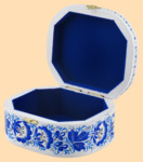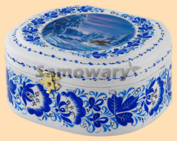 Изысканная шкатулка, расписанная вручную в традициях знаменитой гжельской росписи. Это не просто функциональный аксессуар для хранения ценностей — это подлинное произведение народного искусства, которое станет украшением любого интерьера. Каждое изделие — результат кропотливого ручного труда, поэтому ваша шкатулка будет единственной и неповторимой в своём роде. Подходит для хранения украшений, памятных мелочей, бижутерии или других ценных предметов. Шкатулка станет памятным подарком на юбилей, свадьбу или другой важный праздник. Размер шкатулки 10,5 на 12,5 см, высота 6 см Внутренние размеры 8,5 на 10 см, внутренняя высота 4,5 см Материал шкатулки - дерево Ручная авторская роспись в стиле Гжель, снаружи шкатулка покрыта глянцевым лаком Производитель Россия