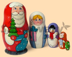 Каталог » Матрёшки » Матрёшки 5-ти местные (сюжетные) » Матрёшка Дед Мороз с подарками средний (5 мест)