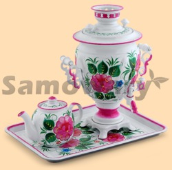 Каталог » Самовары ЭЛЕКТРИЧЕСКИЕ » Самовары электрические на 3л в наборе (расписные - цветы и ягоды) » Набор электрический Розы радужные на белом рюмка (3л)