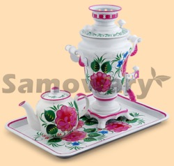 В комплекте заварочный чайник и поднос Самовар: - объем 1,5 литра - высота самовара 33 см - ширина самовара по ручки 24 см - материал: латунь - расписан вручную, покрыт лаком - мощность ТЭНа 1 кВт, время закипания 15 минут - вес самовара 2 кг Чайник: - объем чайника 700 мл - вес чайника 500 гр - материал: фарфор - расписан вручную, покрыт лаком Поднос: - размер 35 см - вес подноса 400 гр - форма подноса может отличаться от фото, возможные формы подносов - круг (диаметр 35 см), овал (34 на 46 см), прямоугольник (30 на 40 см), арка (23 на 40 см), ключ (31 на 41 см), более подробную информацию вам предоставит менеджер - производитель Тула