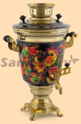 Самовар: - объем 4 литра - высота самовара 43 см - ширина самовара по ручки 30 см - материал: латунь - расписан вручную, покрыт лаком - мощность ТЭНа 1 кВт, время закипания 18-20 минут - вес самовара 2,6 кг Производитель Россия (Тула)