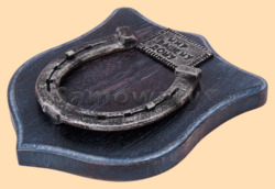 Размер медальона 19 на 22 см Медальон для подковы изготовлен из бука, покрашен под венге и покрыт матовым лаком Размер подковы 13 на 13 см Подкова штампованная, покрыта патиной с серебром Размер таблички 4 на 7 см Табличка кованная, покрыта патиной с серебром Вес подковы - 900 гр. Производитель Россия