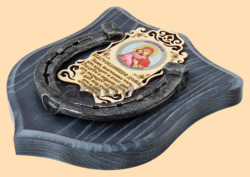 Размер медальона 19 на 22 см Медальон для подковы изготовлен из бука, покрашен под венге и покрыт матовым лаком Размер подковы 13 на 13 см Подкова штампованная, покрыта патиной с серебром По центру подковы размещена деревянная табличка размером 8 на 13 см с ликом святого и молитвой на Благословение дома Вес подковы - 850 гр. Производитель Россия