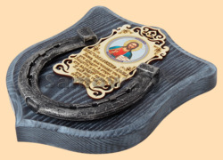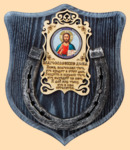 Размер медальона 19 на 22 см Медальон для подковы изготовлен из бука, покрашен под венге и покрыт матовым лаком Размер подковы 13 на 13 см Подкова штампованная, покрыта патиной с серебром По центру подковы размещена деревянная табличка размером 8 на 13 см с ликом святого и молитвой на Благословение дома Вес подковы - 850 гр. Производитель Россия
