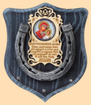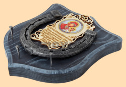 Размер медальона 19 на 22 см, с дополнительными подвесами чтобы вешать ключи (ключница) Медальон для подковы изготовлен из бука, покрашен под венге и покрыт матовым лаком Размер подковы 13 на 13 см Подкова штампованная, покрыта патиной с серебром По центру подковы размещена деревянная табличка размером 8 на 13 см с ликом святого и молитвой на Благословение дома Вес подковы - 850 гр. Производитель Россия
