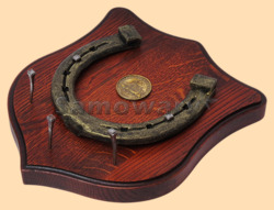 Размер медальона 19 на 22 см, с дополнительными подвесами чтобы вешать ключи (ключница) Медальон для подковы изготовлен из бука, покрашен под вишню и покрыт матовым лаком Размер подковы 13 на 13 см Подкова штампованная, покрыта патиной с золотом В центре медальона закреплена счастливая монета диаметром 3 см Вес подковы - 850 гр. Производитель Россия