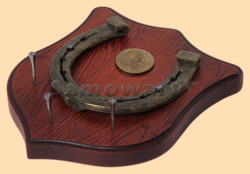 Размер медальона 19 на 22 см, с дополнительными подвесами чтобы вешать ключи (ключница) Медальон для подковы изготовлен из бука, покрашен под вишню и покрыт матовым лаком Размер подковы 13 на 13 см Подкова штампованная, покрыта патиной с золотом В центре медальона закреплена счастливая монета диаметром 3,7 см Вес подковы - 850 гр. Производитель Россия
