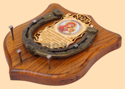 Размер медальона 19 на 22 см, с дополнительными подвесами чтобы вешать ключи (ключница) Медальон для подковы изготовлен из бука, покрашен под дуб и покрыт матовым лаком Размер подковы 13 на 13 см Подкова штампованная, покрыта патиной с золотом По центру подковы размещена деревянная табличка размером 8 на 13 см с ликом святого и молитвой на Благословение дома Вес подковы - 850 гр. Производитель Россия