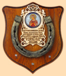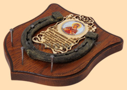 Размер медальона 19 на 22 см, с дополнительными подвесами чтобы вешать ключи (ключница) Медальон для подковы изготовлен из бука, покрашен под дуб и покрыт матовым лаком Размер подковы 13 на 13 см Подкова штампованная, покрыта патиной с золотом По центру подковы размещена деревянная табличка размером 8 на 13 см с ликом святого и молитвой на Благословение дома Вес подковы - 850 гр. Производитель Россия