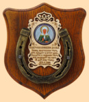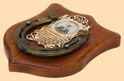 Размер медальона 19 на 22 см Медальон для подковы изготовлен из бука, покрашен под дуб и покрыт матовым лаком Размер подковы 13 на 13 см Подкова штампованная, покрыта патиной с золотом По центру подковы размещена деревянная табличка размером 8 на 13 см с ликом святого и молитвой на Благословение дома Вес подковы - 850 гр. Производитель Россия
