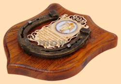 Размер медальона 19 на 22 см Медальон для подковы изготовлен из бука, покрашен под дуб и покрыт матовым лаком Размер подковы 13 на 13 см Подкова штампованная, покрыта патиной с золотом По центру подковы размещена деревянная табличка размером 8 на 13 см с ликом святого и молитвой на Благословение дома Вес подковы - 850 гр. Производитель Россия