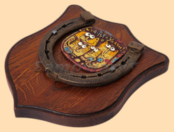 Размер медальона 19 на 22 см Медальон для подковы изготовлен из бука, покрашен под дуб и покрыт матовым лаком Размер подковы 13 на 13 см Подкова штампованная, покрыта патиной с золотом По центру подковы размещена декоративная керамическая вставка Вес подковы - 900 гр. Производитель Россия