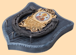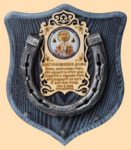 Размер медальона 19 на 22 см, с дополнительными подвесами чтобы вешать ключи (ключница) Медальон для подковы изготовлен из бука, покрашен под венге и покрыт матовым лаком Размер подковы 13 на 13 см Подкова штампованная, покрыта патиной с серебром По центру подковы размещена деревянная табличка размером 8 на 13 см с ликом святого и молитвой на Благословение дома Вес подковы - 850 гр. Производитель Россия