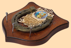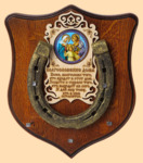 Размер медальона 19 на 22 см, с дополнительными подвесами чтобы вешать ключи (ключница) Медальон для подковы изготовлен из бука, покрашен под дуб и покрыт матовым лаком Размер подковы 13 на 13 см Подкова штампованная, покрыта патиной с золотом По центру подковы размещена деревянная табличка размером 8 на 13 см с ликом святого и молитвой на Благословение дома Вес подковы - 850 гр. Производитель Россия