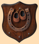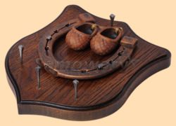 Размер медальона 19 на 22 см, с дополнительными подвесами чтобы вешать ключи (ключница) Медальон для подковы изготовлен из бука, покрашен под дуб и покрыт матовым лаком Размер подковы 13 на 13 см Подкова штампованная, покрыта патиной с медью Размер лаптей 3 на 5 см, материал обожжённая глина, молочение Вес подковы - 850 гр. Производитель Россия