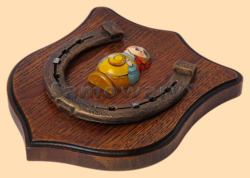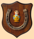 Размер медальона 19 на 22 см Медальон для подковы изготовлен из бука, покрашен под дуб и покрыт матовым лаком Размер подковы 13 на 13 см Подкова штампованная, покрыта патиной с медью По центру подковы размещена декоративная накладка в виде матрёшки с традиционным русским народным сюжетом Вес подковы - 850 гр. Производитель Россия