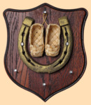Размер медальона 19 на 22 см, с дополнительными подвесами чтобы вешать ключи (ключница) Медальон для подковы изготовлен из бука, покрашен под вишню и покрыт матовым лаком Размер подковы 13 на 13 см Подкова штампованная, покрыта патиной с золотом Размер лаптей 2 на 6 см, лапти изготовлены из лыка Вес подковы - 850 гр. Производитель Россия