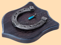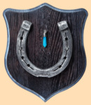 Размер медальона 19 на 22 см Медальон для подковы изготовлен из бука, покрашен под венге и покрыт матовым лаком Размер подковы 13 на 13 см Подкова штампованная, покрыта патиной с серебром В качестве декоративного элемента использована подвеска с голубым агатом Вес подковы - 850 гр. Производитель Россия