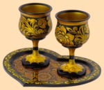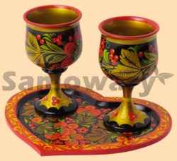 В наборе два фужера и поднос Размер подноса 18 на 22 см Высота фужера 14 см, диаметр 8 см Объём 150 мл Материал дерево Хохлома, ручная работа Производитель Россия