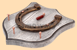 Размер медальона 19 на 22 см, с дополнительными подвесами чтобы вешать ключи (ключница) Медальон для подковы изготовлен из бука, покрашен под светлое дерево и покрыт матовым лаком Размер подковы 13 на 13 см Подкова штампованная, покрыта патиной с медью В качестве декоративного элемента использована подвеска с красной яшмой Вес подковы - 850 гр. Производитель Россия
