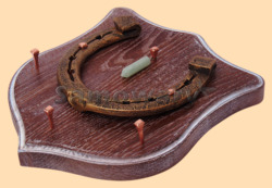 Размер медальона 19 на 22 см, с дополнительными подвесами чтобы вешать ключи (ключница) Медальон для подковы изготовлен из бука, покрашен под орех и покрыт матовым лаком Размер подковы 13 на 13 см Подкова штампованная, покрыта патиной с медью В качестве декоративного элемента использована подвеска из нефрита Вес подковы - 850 гр. Производитель Россия