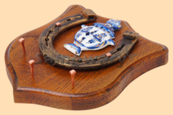 Размер медальона 19 на 22 см, с дополнительными подвесами чтобы вешать ключи (ключница) Медальон для подковы изготовлен из бука, покрашен под дуб и покрыт матовым лаком Размер подковы 13 на 13 см Подкова штампованная, покрыта патиной с медью В качестве декоративнго элемента использован сувенирный самовар из фарфора, расписанный в Гжели и покрытый позолотой Размер самовара 7 на 9 см Вес подковы - 900 гр. Производитель Россия