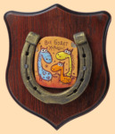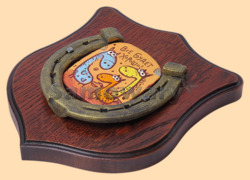 Размер медальона 19 на 22 см Медальон для подковы изготовлен из бука, покрашен под вишню и покрыт матовым лаком Размер подковы 13 на 13 см Подкова штампованная, покрыта патиной с золотом По центру подковы размещена декоративная керамическая вставка Вес подковы - 900 гр. Производитель Россия