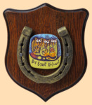 Размер медальона 19 на 22 см Медальон для подковы изготовлен из бука, покрашен под дуб и покрыт матовым лаком Размер подковы 13 на 13 см Подкова штампованная, покрыта патиной с золотом По центру подковы размещена декоративная керамическая вставка Вес подковы - 900 гр. Производитель Россия