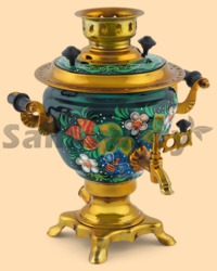 Самовар: - объем 2 литра - высота самовара 32 см - ширина самовара по ручки 30 см - материал: латунь - расписан вручную, покрыт лаком - мощность ТЭНа 1 кВт, время закипания 18-20 минут - вес самовара 2,3 кг - производитель Россия (Тула)