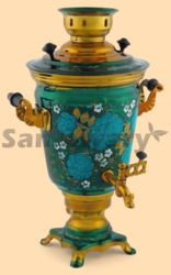 Самовар: - объем 4 литра - высота самовара 43 см - ширина самовара по ручки 30 см - материал: латунь - расписан вручную, покрыт лаком - мощность ТЭНа 1 кВт, время закипания 18-20 минут - вес самовара 2,6 кг Производитель Россия (Тула)