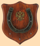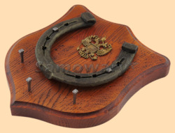 Размер медальона 19 на 22 см, с дополнительными подвесами чтобы вешать ключи (ключница) Медальон для подковы изготовлен из бука, покрашен под вишню и покрыт матовым лаком Размер подковы 13 на 13 см Подкова штампованная, покрыта патиной с золотом Размер декоративной накладки из бронзы в виде Герба России 4,5 на 5 см Вес подковы - 850 гр. Производитель Россия