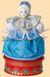Высота 21 см Материал: ткань - хлопок и хлопок с вискозой, лица и руки фарфор, само основание - дерево липа Мелодия - "Катюша" Производитель Россия